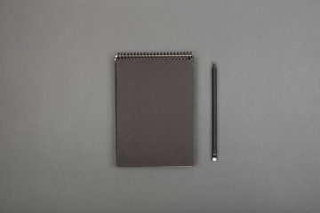 Top view of open spiral blank notebook with pencil on gray background