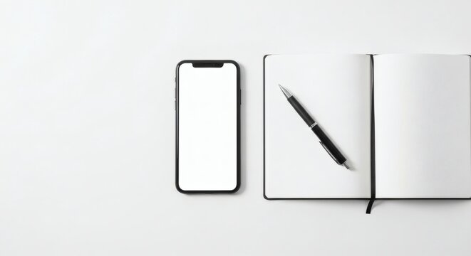 Modern Mockup Smartphone and Notebook on White, Minimalist Composition