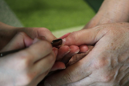 A student at the training courses of a manicure prepares the hand of a lady client with a manicure scissors for cuticles before applying shellac