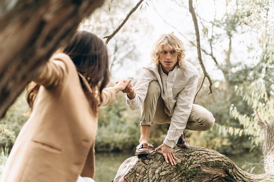 A beautiful couple in the boo style embraces sitting on a branch over the lake