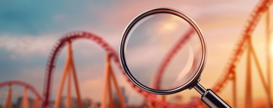 A magnifying glass focuses on a roller coaster, symbolizing excitement and thrill against a vibrant sunset backdrop.
