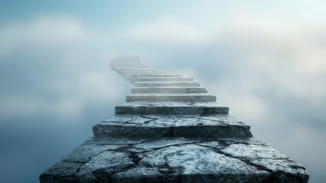 Surreal pathway of floating books leading into the clouds, symbolizing the journey of knowledge and imagination into the unknown.