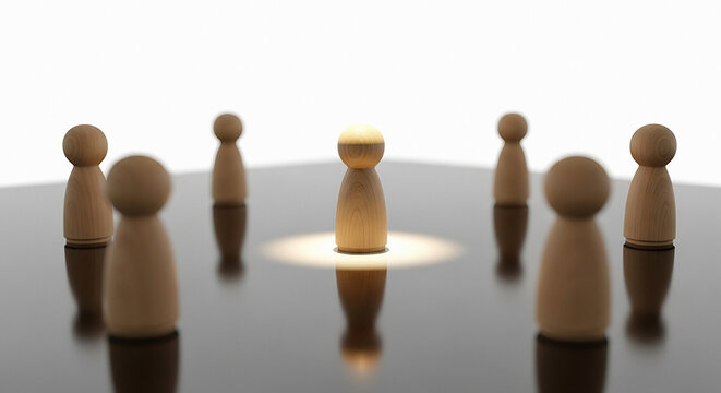 Unique wooden peg figure stands out surrounded by others in spotlight concept of individuality leadership