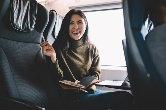Laughing woman looking at camera and making notes in diary in train