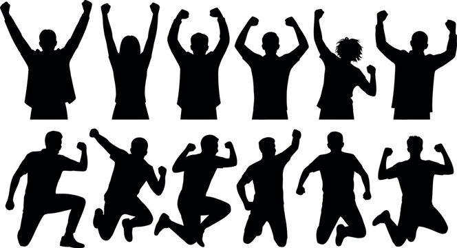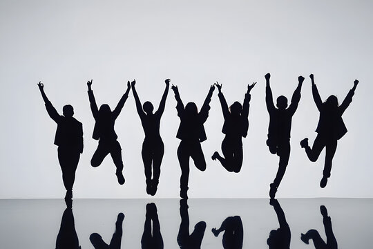 Silhouettes of joyful people jumping in unison, symbolizing celebration, teamwork, and energy, perfect for motivational, corporate, or creative designs with a focus on unity and success