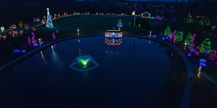 Colorful holiday lights brighten a park pond at night, showcasing decorated trees and structures around the water. The scene captures festive cheer and joy during the holiday season.