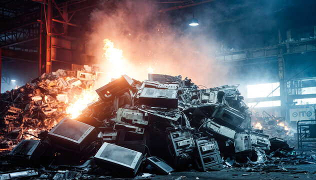 A large pile of electronic waste is on fire in a junkyard The fire is sending up thick plumes of smoke