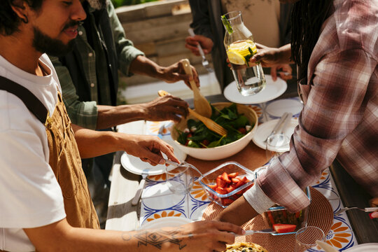 Diverse friends having lunch in community garden