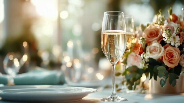 A beautifully arranged table setting with sparkling champagne flutes and a floral centerpiece radiates joy and elegance, perfect for celebrating love and special occasions.