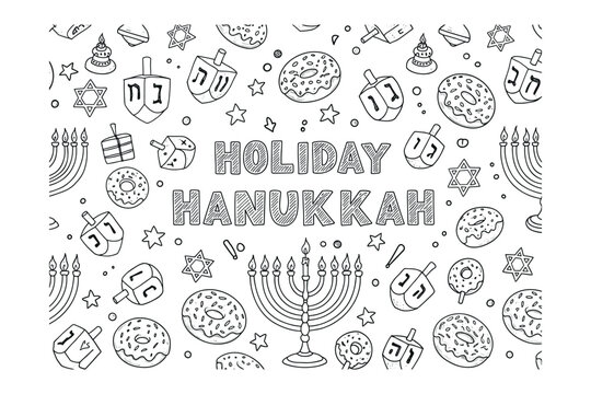 Hanukkah celebration coloring page festive holiday family fun creative activity joyful atmosphere. Vector illustration