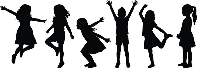 Children silhouette, playful poses, joyful movement, black artwork, white background, expressive motion, childhood energy, dynamic stance, fun illustration, activity