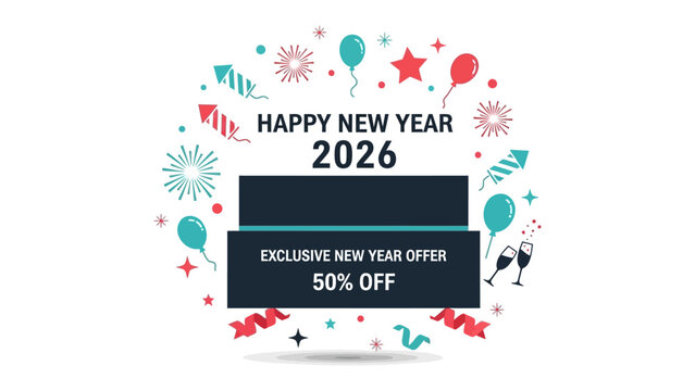 New Year 2026 Celebration Offer: A festive graphic design with celebratory elements announces a Happy New Year 2026 promotion, featuring discounts and offers for a joyful start.