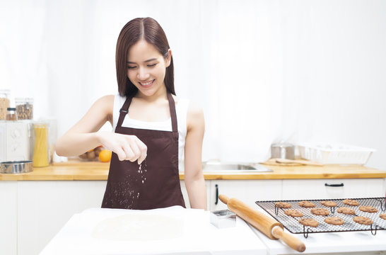 Beautiful Asian woman preparing dough for cookies, sprinkling white flour over raw dough in the kitchen