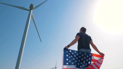 Native American boy with flag with stars and stripes near giant windmills in the field. Love to your country. Celebrating 4th July Independence Day. 4K in slow motion. American dream.