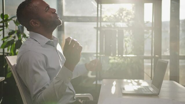 Happy adult African American man dancing at sunlight sunny office workplace joyful 40s middle-aged businessman male celebrating victory rejoicing dance music working success good business advancement