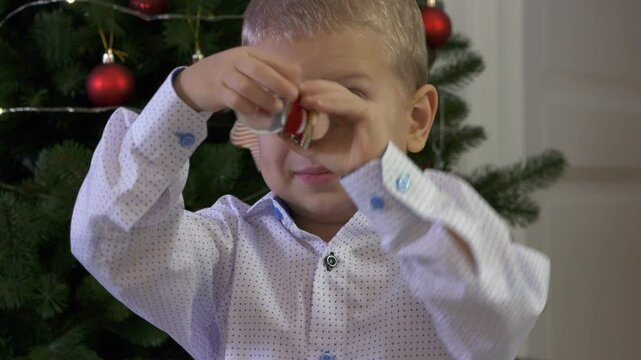 Happy child holding snow globe with figurine of Santa Claus. Smiling face of little boy near Christmas tree. Merry Christmas and Happy New year winter holidays.