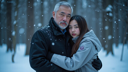 Senior couple embracing joyfully in winter climate