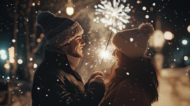 A young couple leans in for a kiss surrounded by glowing lights during a winter celebration. The atmosphere is joyful and romantic under the night sky
