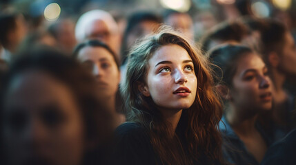 Top view of grey crowd of identical people and special one woman, difference and diversity concept. Unique among the faceless, not like everyone else. Listening to music, looks happy. Collage
