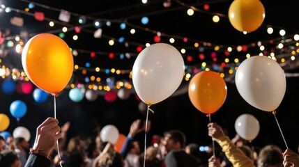 A joyful celebration filled with floating balloons, colorful lights, and a festive crowd enjoying a night of merriment and togetherness.