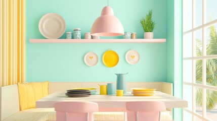 Vibrant Culinary Delight - A Cheerful Kitchen Nook Filled with Playful Decor and Eclectic Dishware for Joyful Cooking Experiences