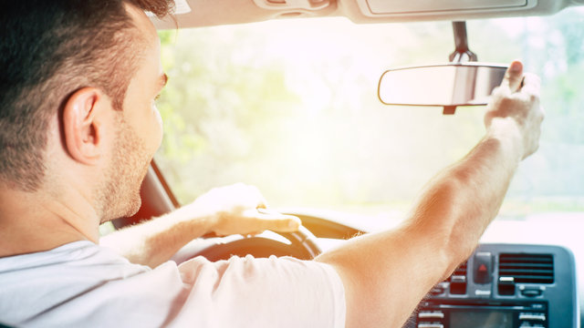 Happy handsome young man driving his car and smiling. Excited driver in urban city. Electro car, vehicle of future.