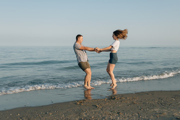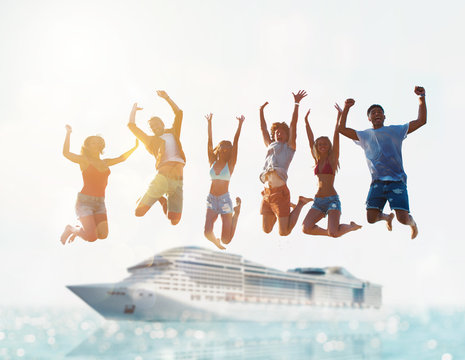 Happy smiling couples playing at the beach with cruiseship in the sea