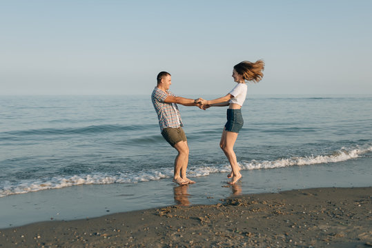 Joyful Couple Jumping on Beach at Sunset.