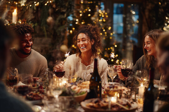 Diverse friends celebrating with sparklers in stylish gathering