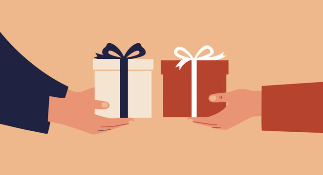 A warm flat design illustration depicting the joyful tradition of exchanging gifts during Diwali, symbolizing sharing and prosperity. This vector art captures the spirit of generosity and connection.