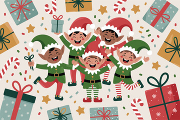 Four elves celebrating with joy and gifts in a festive atmosphere surrounded by colorful presents and decorations