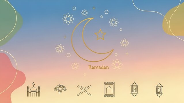 A joyful Muslim boy in traditional clothing holds a gift box under a crescent moon, a hand-drawn illustration for a religious celebration.