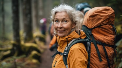 senior woman hiking in mountainous area. enjoy nature, have a good time. healthy lifestyle, leisure activity in old age. elderly travel