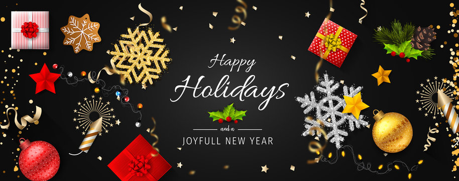 Dark Green Happy Holidays and Joyful New Year Horizontal Vector 2