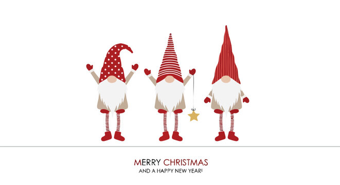 Three cheerful gnomes celebrating Merry Christmas and a Happy New Year with festive hats and stars, perfect for holiday greetings