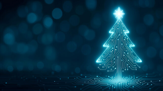A futuristic Christmas tree with circuit details and a glowing star on a blue background with bokeh. Christmas and New Year's concept.