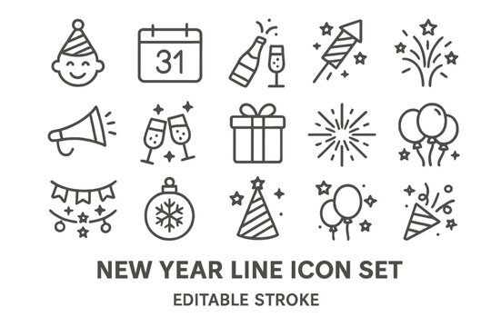 New Year celebration vector icon set featuring festive symbols and activities for the holiday season