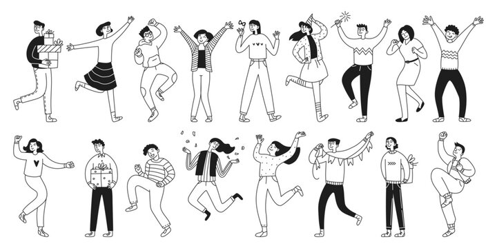 Big set of celebrating people. Collection with joyful jumping men and women celebrating an event or ceremony. Outline, line. Vector doodle illustration