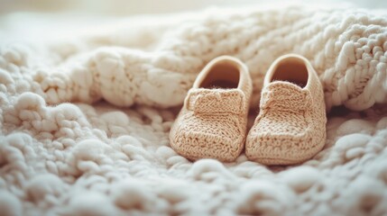 Pregnancy Announcement with Baby Shoes A pregnancy announcement scene with a pair of baby shoes placed on a soft blanket, celebrating the joyful news.