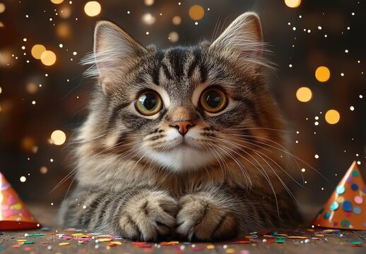 Happy dog with a party hat surrounded by colorful confetti, celebrating a joyful occasion. Fun and festive image perfect for events and celebrations. AI