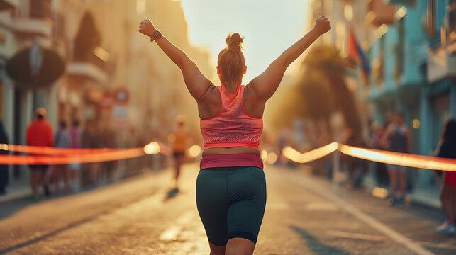 A plus-sized runner crossing the finish line with arms raised in triumph during a marathon. fat woman running
