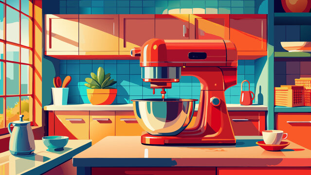 Vibrant retro kitchen scene evokes nostalgia with modern mixer, promising delicious treats and joyful baking experiences in a sunlit culinary space