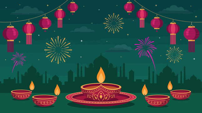 Detailed vector illustration of Diwali Diyas, festive lanterns and fireworks over an Indian city silhouette, concept for cultural celebration, seasonal greetings and holiday promotion