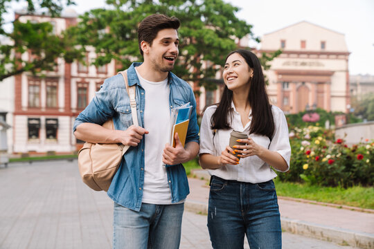 Beautiful happy couple autumn portrait. Young joyful smiling woman and man in a city in winter.  Love, travel, tourism, students concept