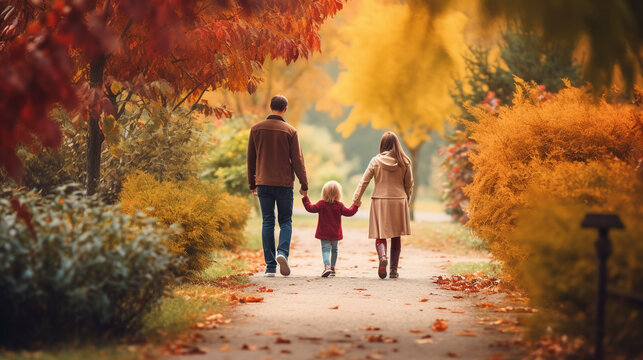 Family Harvest Walk in a Vibrant Park, Thanksgiving background, wide banner with copy space area Generative AI