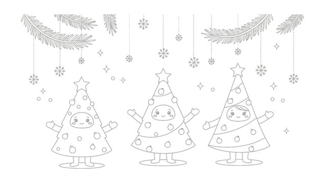 Festive Cheer: Whimsical Christmas trees in delightful poses, joyfully adorned with stars and snowflakes, capturing the whimsical spirit of the holiday season.