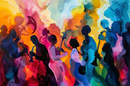 A vibrant painting depicting a group of people joyfully playing various musical instruments, An abstract representation of music and laughter filling the air at a lively gathering