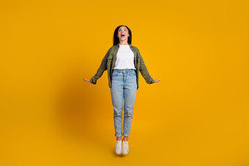 Cheerful young woman wearing casual fashion poses joyfully against a yellow background