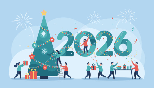 Vibrant vector illustration depicting a group of small people joyfully preparing for the New Year 2026, decorating a Christmas tree with lights and ornaments, exchanging gifts, and celebrating with