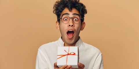 man showing exaggerated expression of surprise while holding a white gift box with a red ribbon, for use in promotional materials, excitement, in social media to highlight special offers or surprises